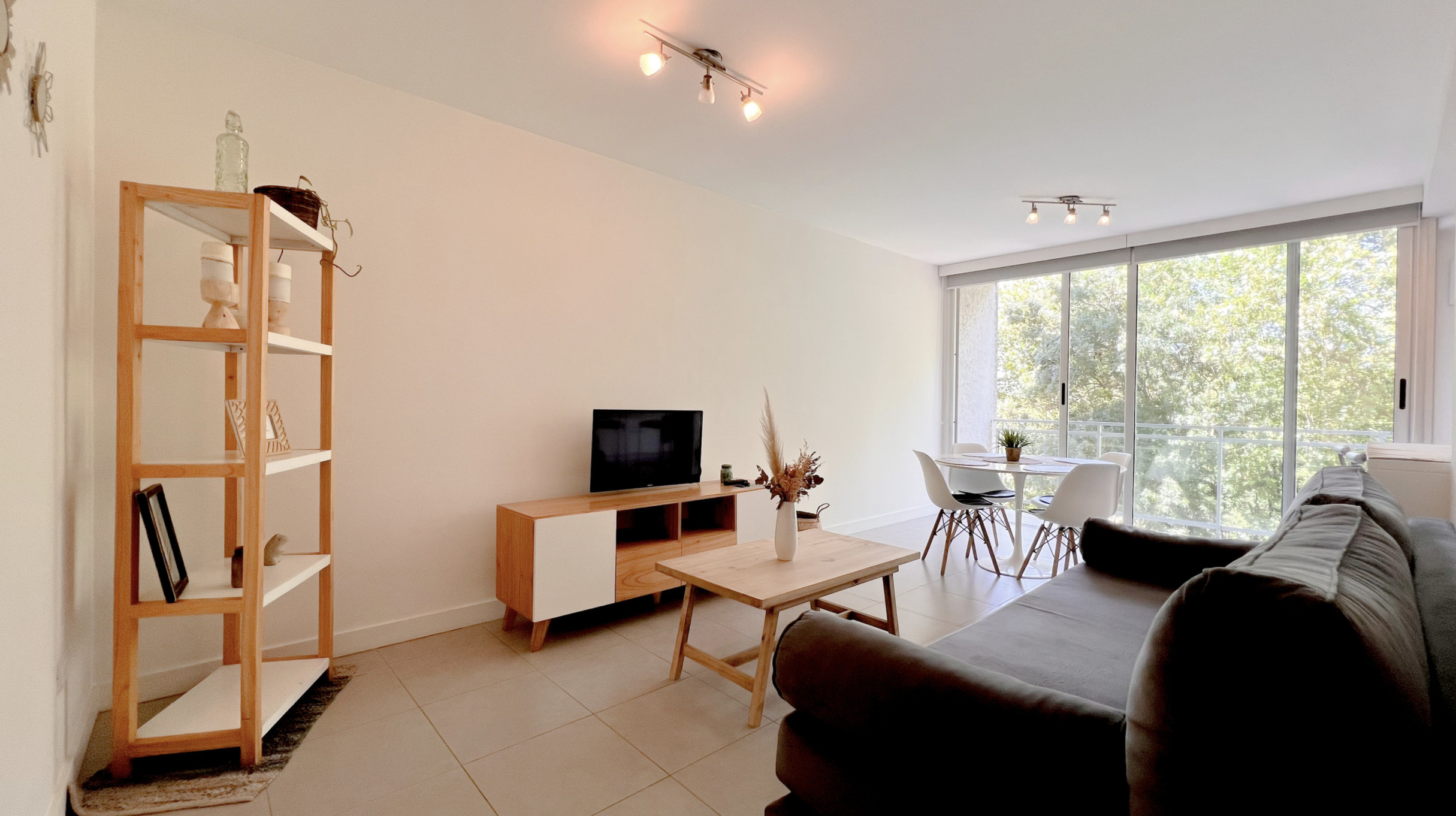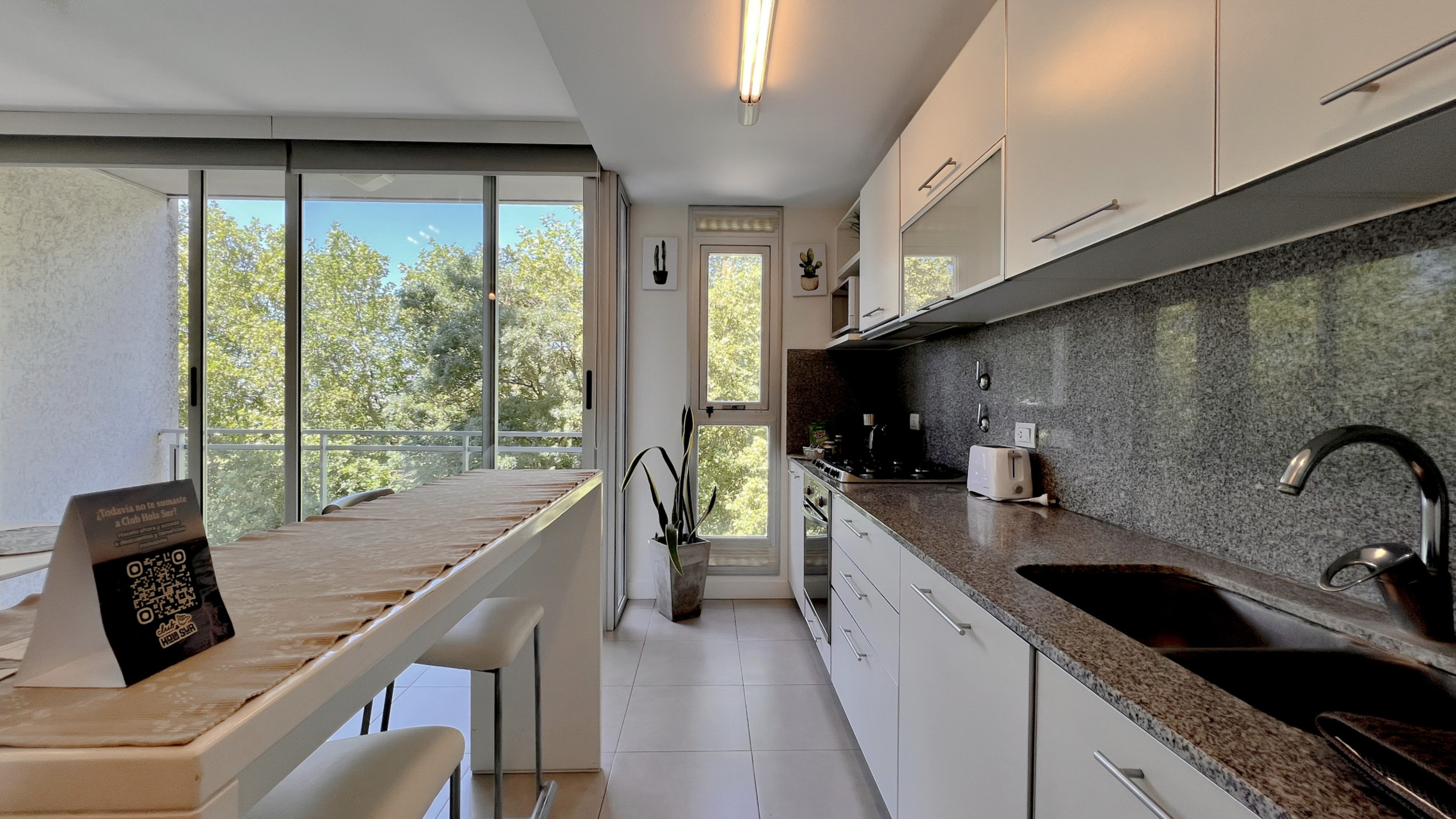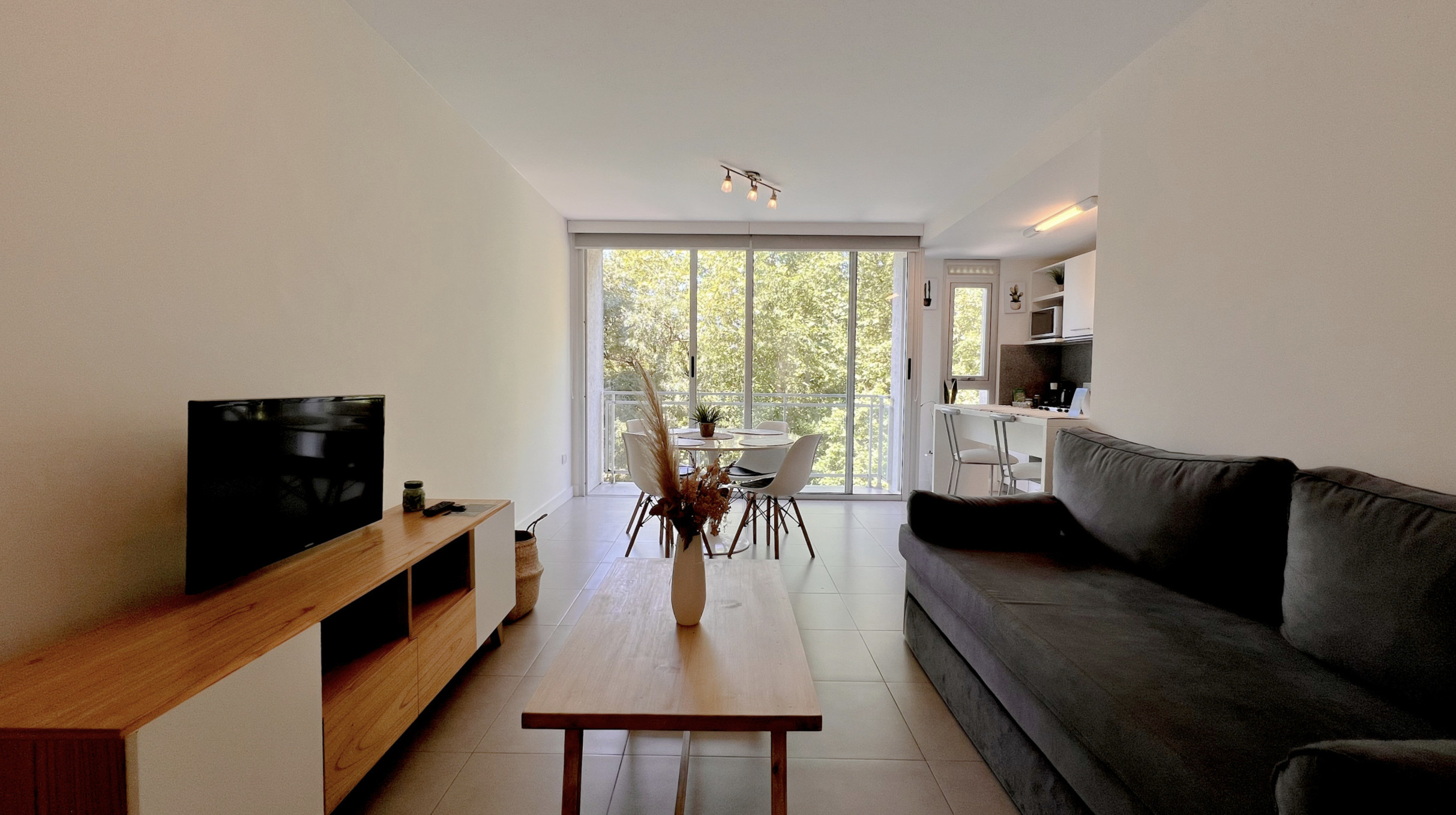 Depto Al está ubicado frente a una plaza del barrio San Carlos, lo que le da una vista abierta y un entorno verde que se disfruta desde el living.
