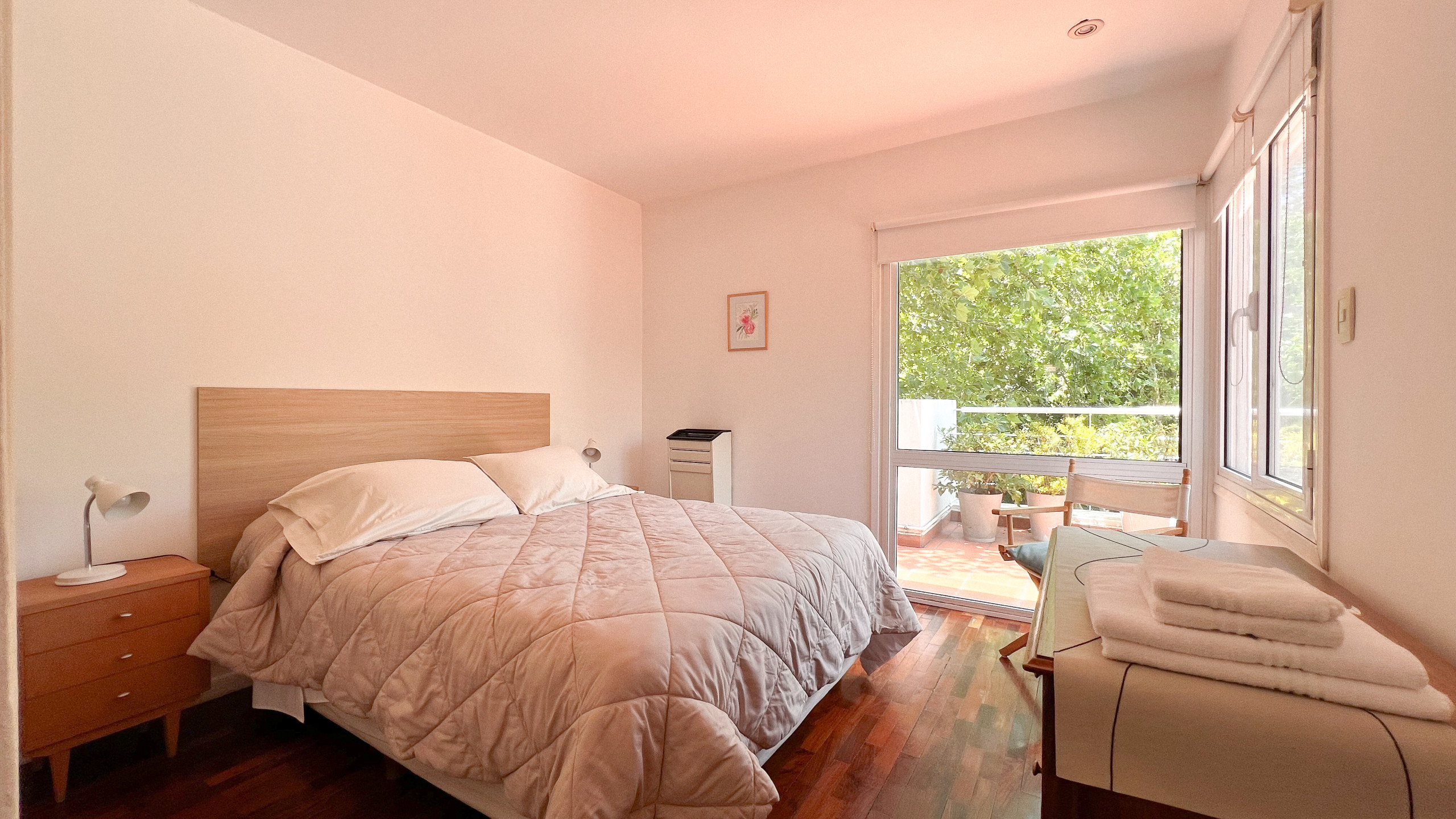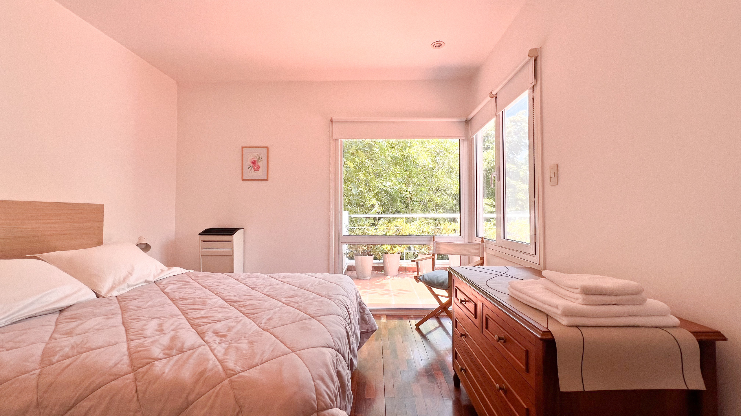 Depto Lila está ubicada en un segundo piso por escalera y tiene 3 ambientes cómodos y funcionales, con capacidad para hospedar a 4 personas. Cuenta con cocina completa, living comedor con aire acondicionado y calefacción a gas por calefactores. Tiene dos habitaciones: la principal con cama matrimonial, y otra con dos camas simples, una de ellas con carrito debajo, opcional para un quinto huésped si es un niño. Además, tiene un baño compartimentado con ducha. Afuera te espera una gran terraza con vista a la plaza y parrilla techada: el plan ideal para disfrutar asados sin importar el clima.