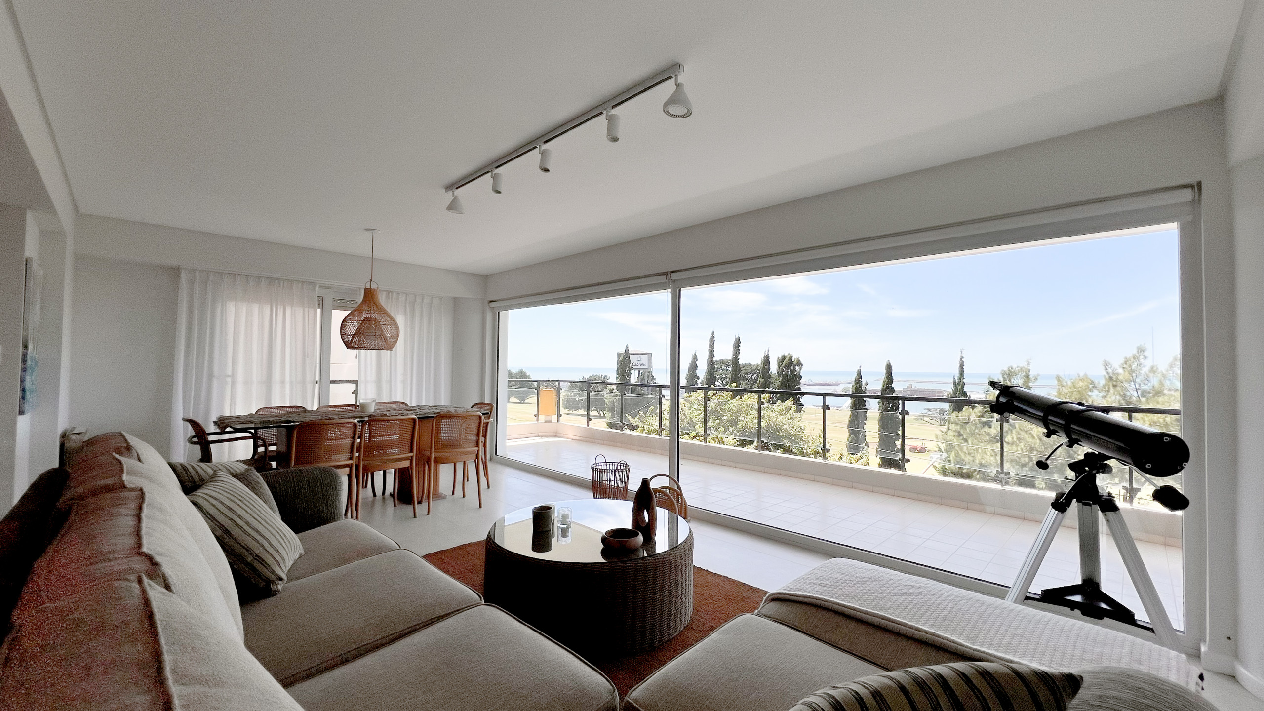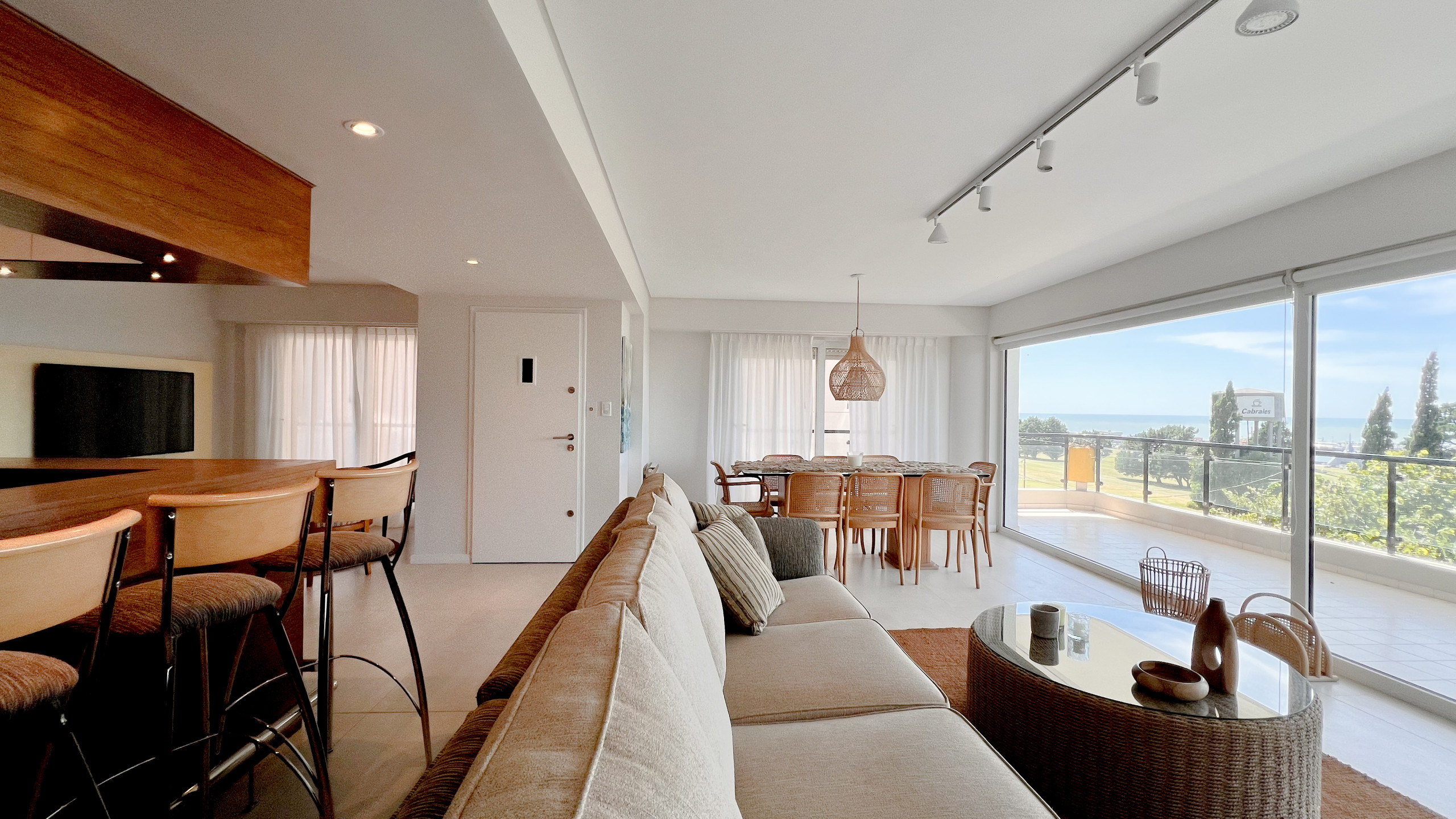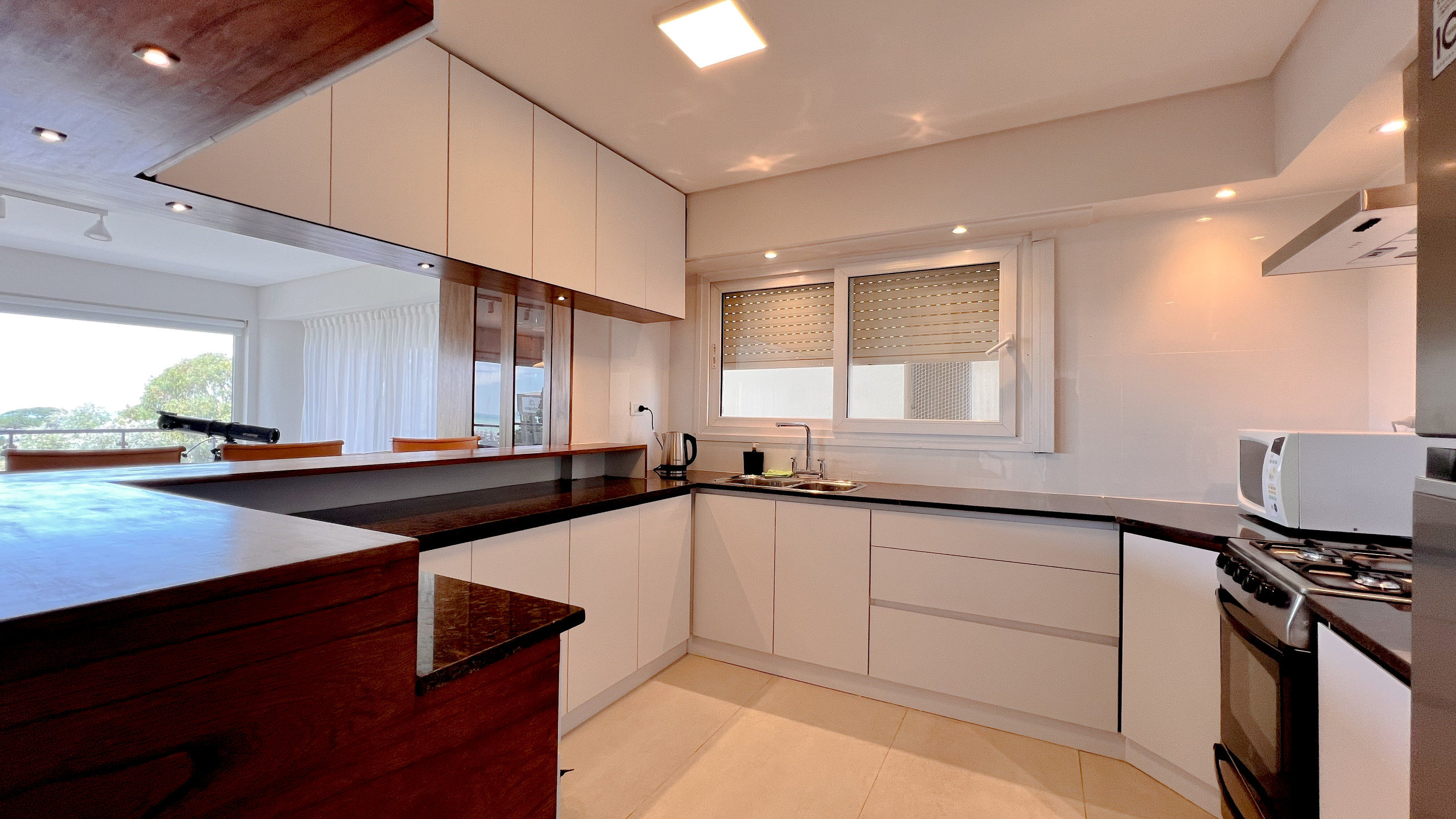 El living comedor es amplio y luminoso, con grandes ventanales que enmarcan una vista abierta al Golf de Playa Grande y al mar, creando un ambiente ideal para descansar, compartir comidas o disfrutar del paisaje en cualquier momento del día. La cocina está totalmente equipada y pensada para estadías cortas o prolongadas, con todo lo necesario para sentirse como en casa.