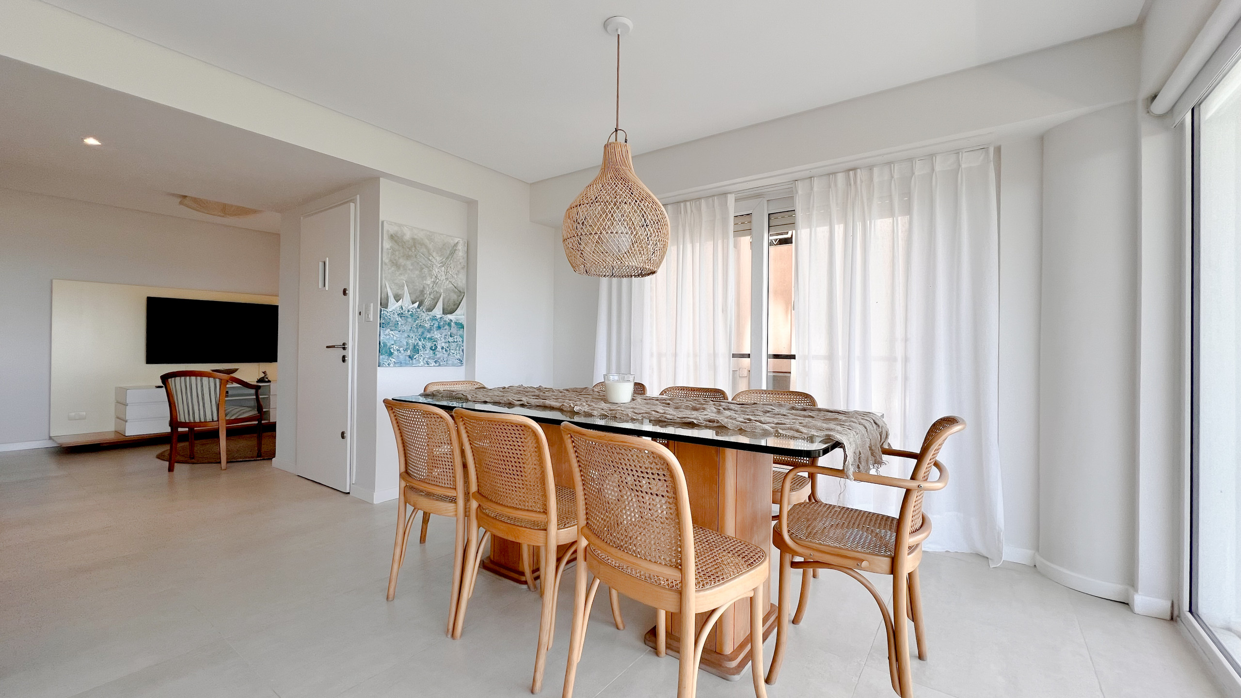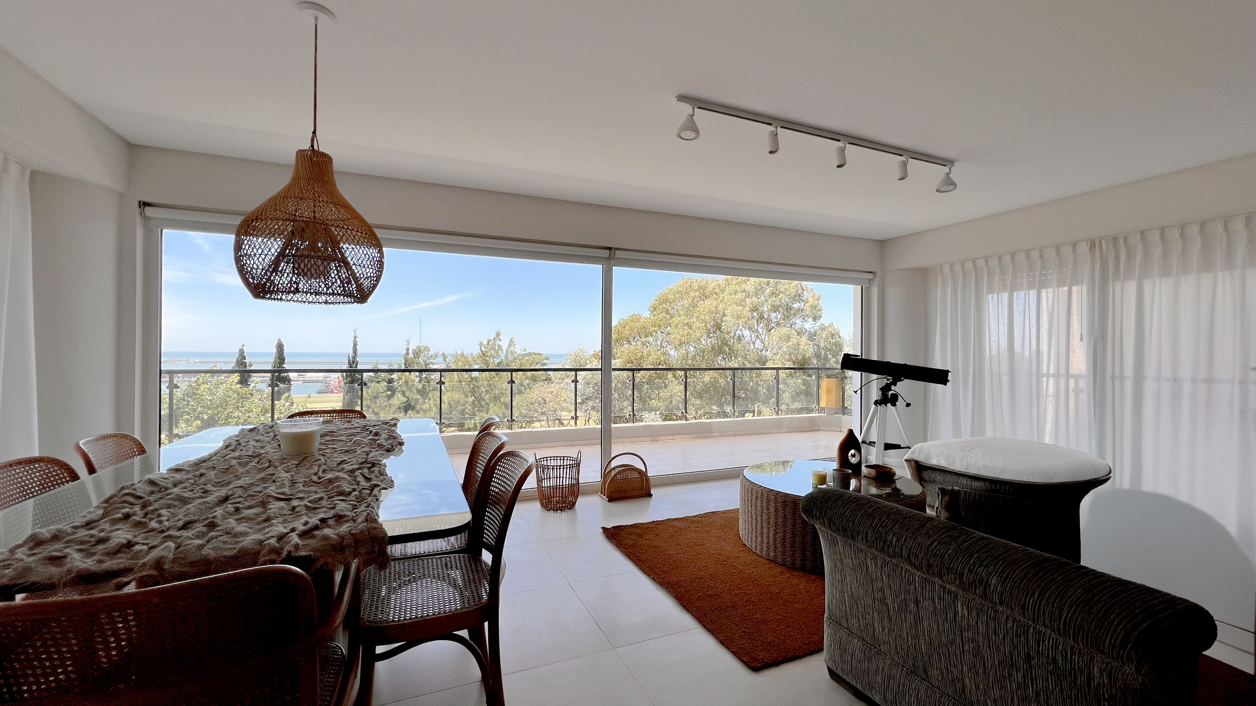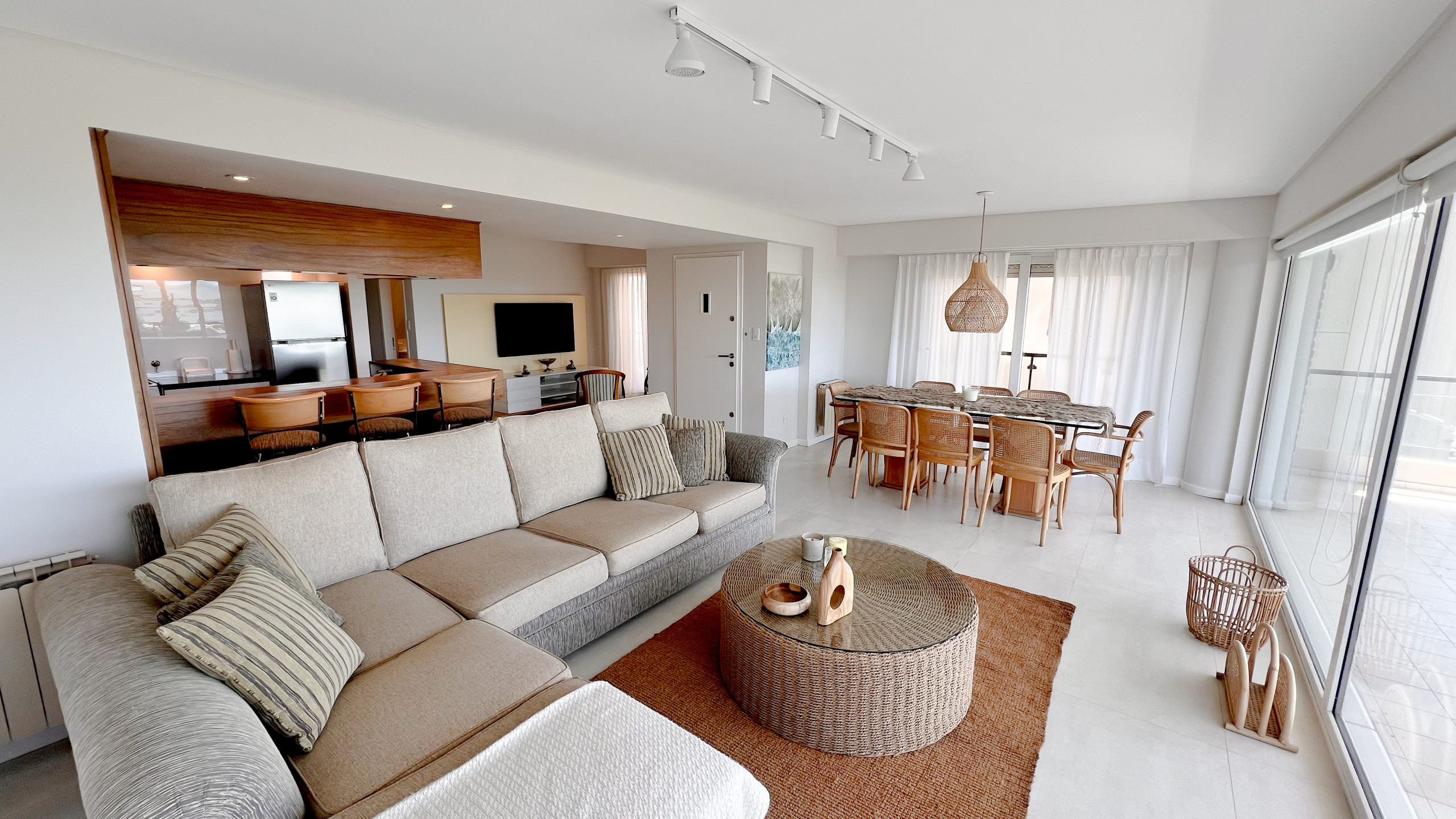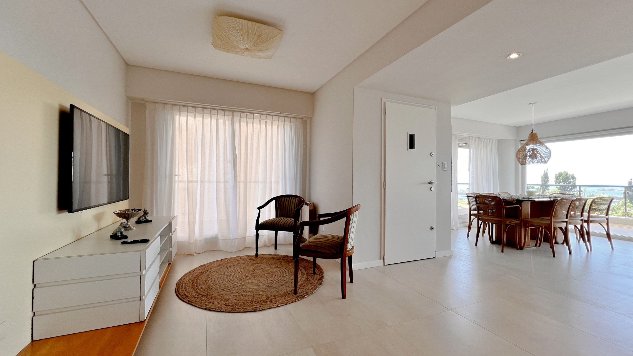 El living comedor es amplio y luminoso, con grandes ventanales que enmarcan una vista abierta al Golf de Playa Grande y al mar, creando un ambiente ideal para descansar, compartir comidas o disfrutar del paisaje en cualquier momento del día. La cocina está totalmente equipada y pensada para estadías cortas o prolongadas, con todo lo necesario para sentirse como en casa.
