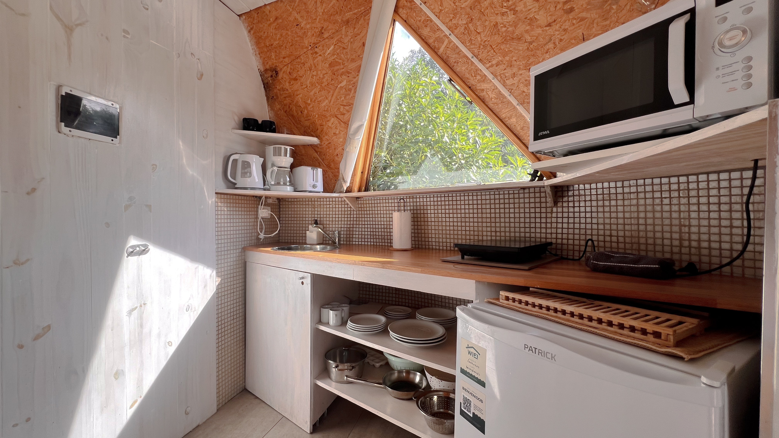 Cada domo es un loft donde entran 2 personas cómodas y una posibilidad de un extra (niño o niña) en un entrepiso dentro de cada unidad. Las camas, dependiendo de la unidad, se pueden adaptar para ser cama doble o camas simples, preguntanos según tu necesidad. Además, una pequeña cocina bien equipada te va a solucionar todas las comidas de tu estadía y el estar-comedor te permite poder desayunar o tomar un vino con una temperatura cálida dentro del domo en el caso de no querer estar en el deck. Cada deck cuenta con reposeras y espacio para poder disfrutar de forma privada tu descanso.