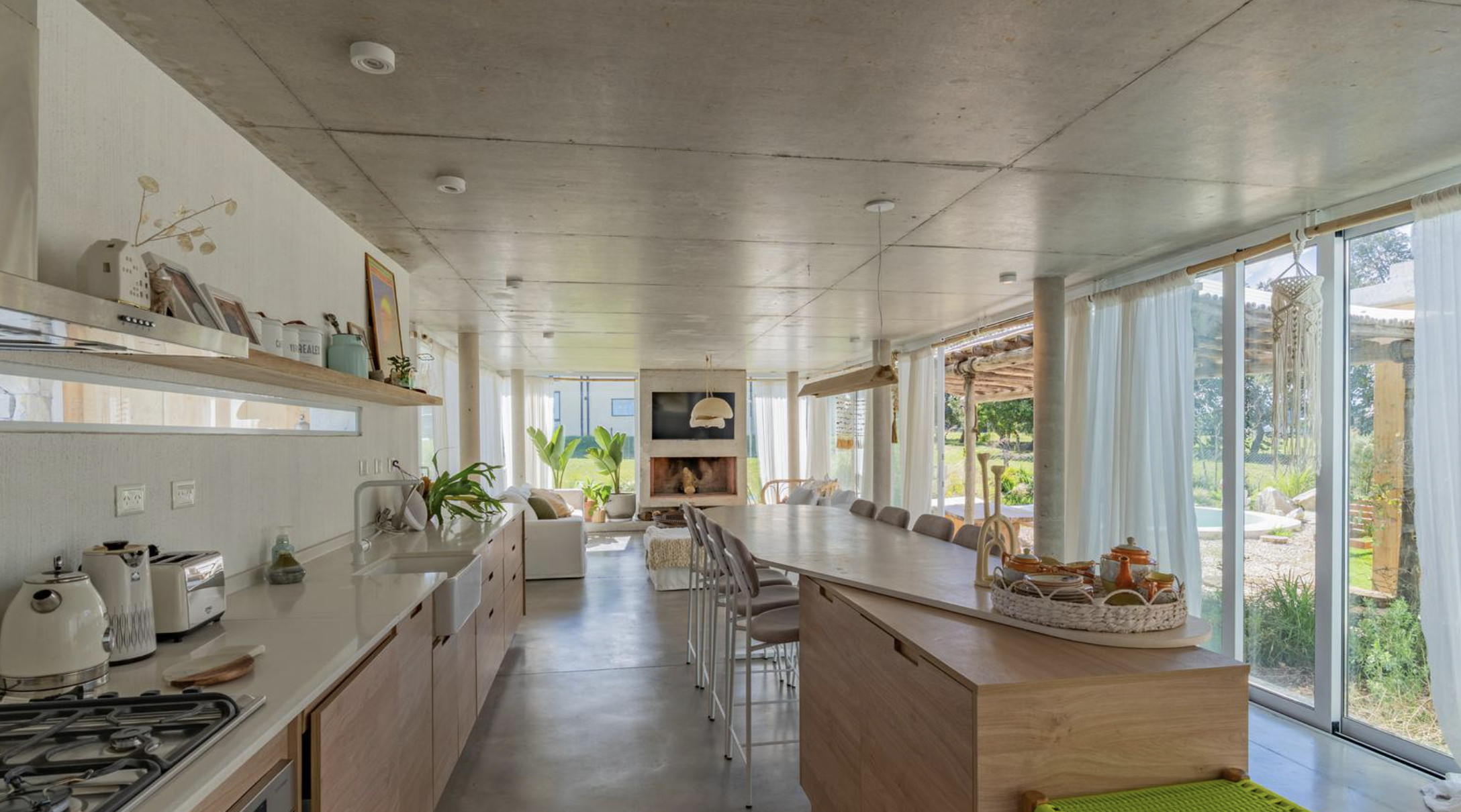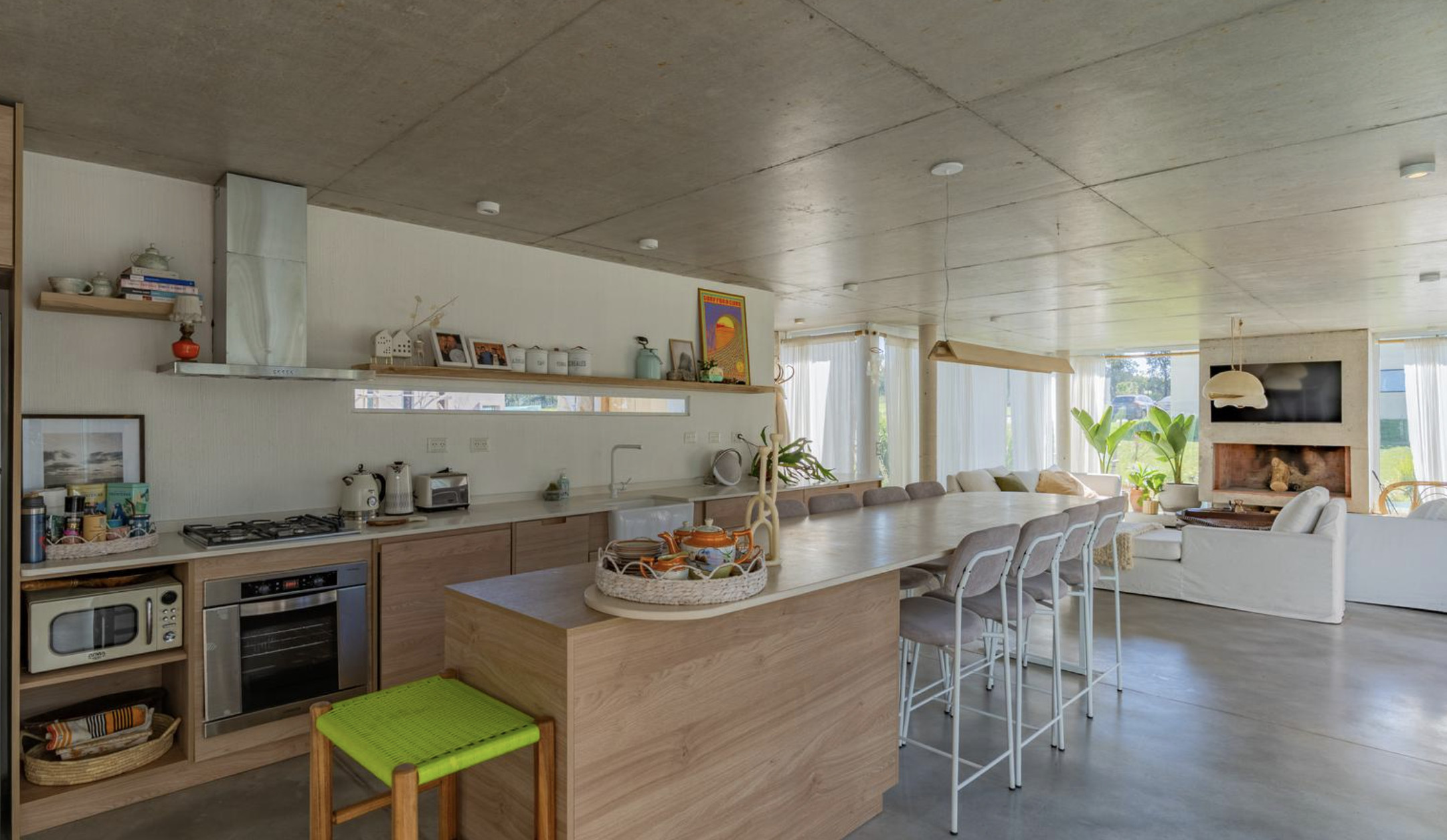 El corazón de la casa es su cocina integrada con una amplia barra estilo alta, ideal para compartir desayunos o cenas en un ambiente relajado. En el exterior, la pileta climatizada tipo estanco es perfecta para refrescarse en cualquier momento del día, mientras que el fogonero invita a disfrutar de largas noches bajo las estrellas.