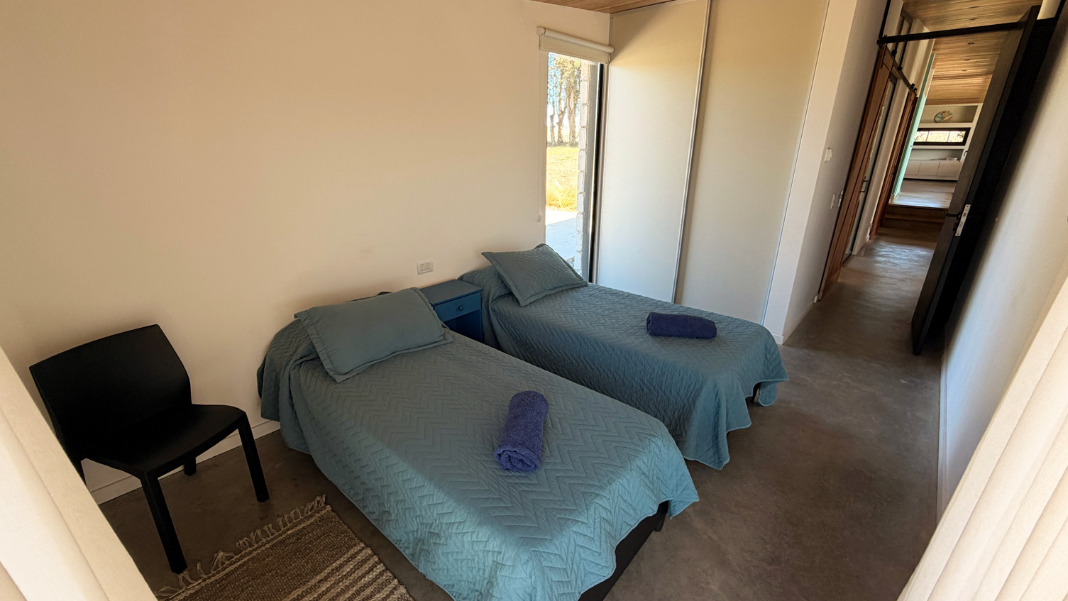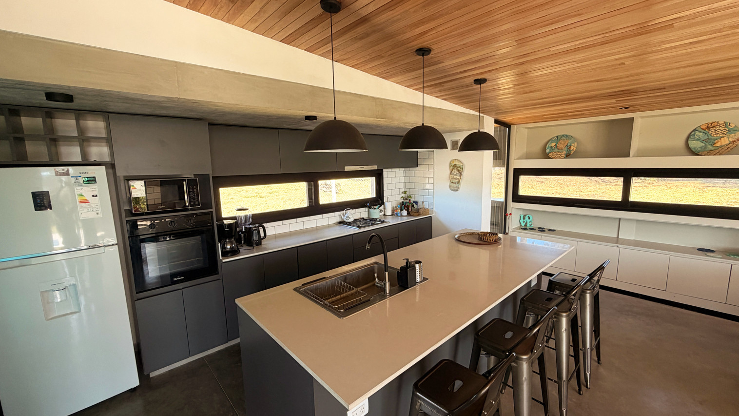 A casa conta com 3 quartos: o principal em suite com closet e salamandra no mesmo quarto (e nem falar da vista espetacular para o campo). O segundo quarto tem 2 camas individuais e o terceiro com cama estilo beliche, mais pequeno mas igualmente confortável e luminoso. Além disso, uma cozinha integrada com balcão, sala de jantar e sala de estar com smart TV e salamandra, e uma varanda coberta com churrasqueira bem integrada à casa.