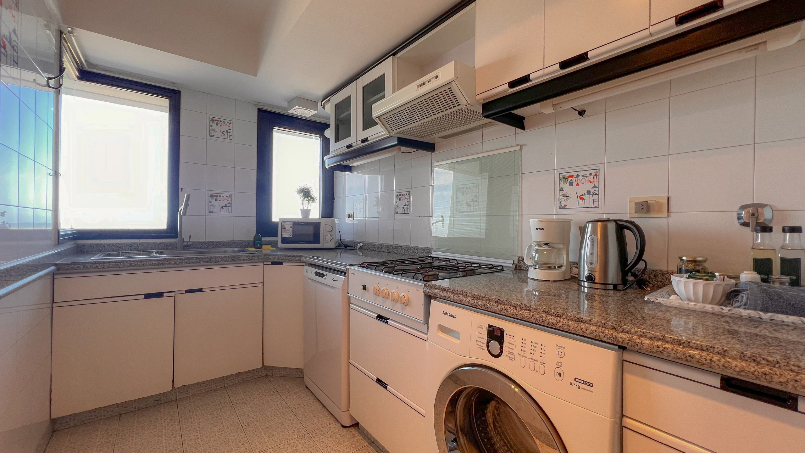 A cozinha, de gás, está equipada com frigorífico, microondas, forno, congelador, máquina de lavar louça, louça/talheres, utensílios/cozinha, máquina de café, torradeira e máquina de sumos.