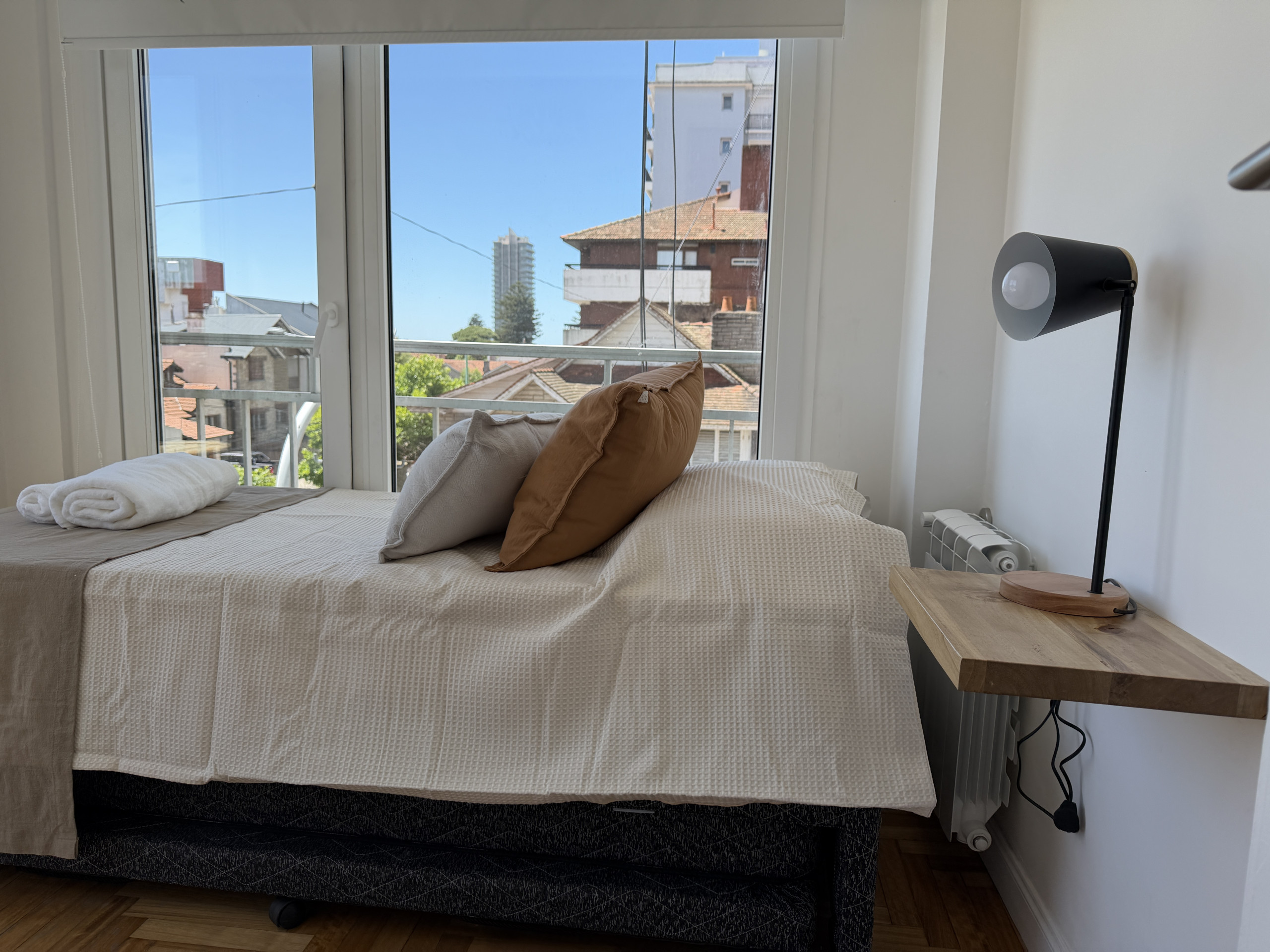 Este departamento foi pensado para que desfrutes Mar del Plata como um local. Tudo é novo, com materiais quentes, luz natural que entra toda a tarde e um estilo simples e contemporâneo. A localização é ideal: a uma quadra do Parque San Martín —um dos mais bonitos da cidade, com vistas para o mar incríveis— e a poucas quadras da Praia Grande, para descer a pé todos os dias sem mover o carro.