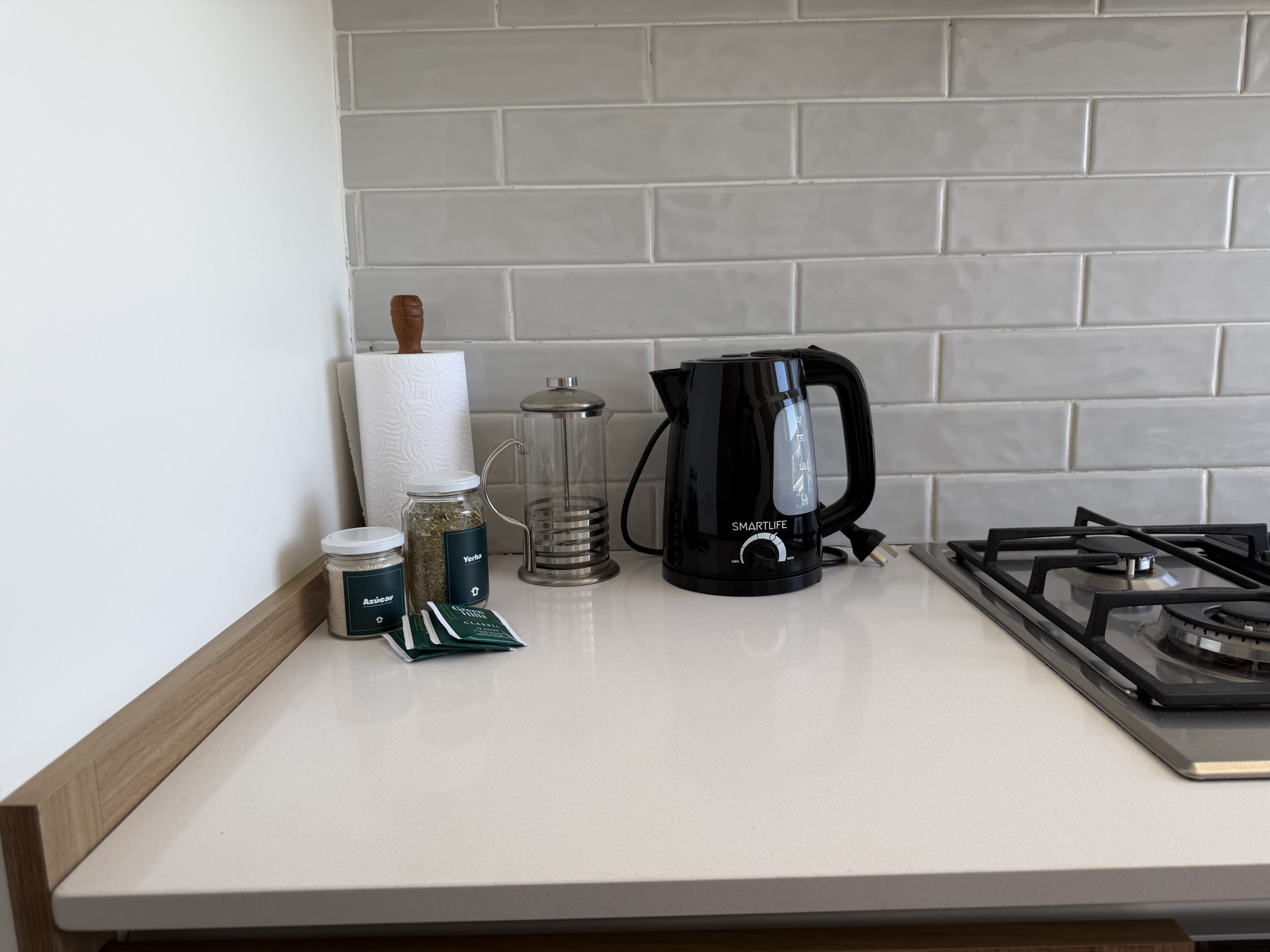 A sala tem uma atmosfera relaxada, com pormenores de design, TV e uma mistura de madeira e tons neutros que a tornam super acolhedora. A cozinha, completamente nova, está equipada para que possa cozinhar confortavelmente durante a sua estadia. Também vai encontrar livros e pormenores pensados para aquele momento de pausa após a praia.