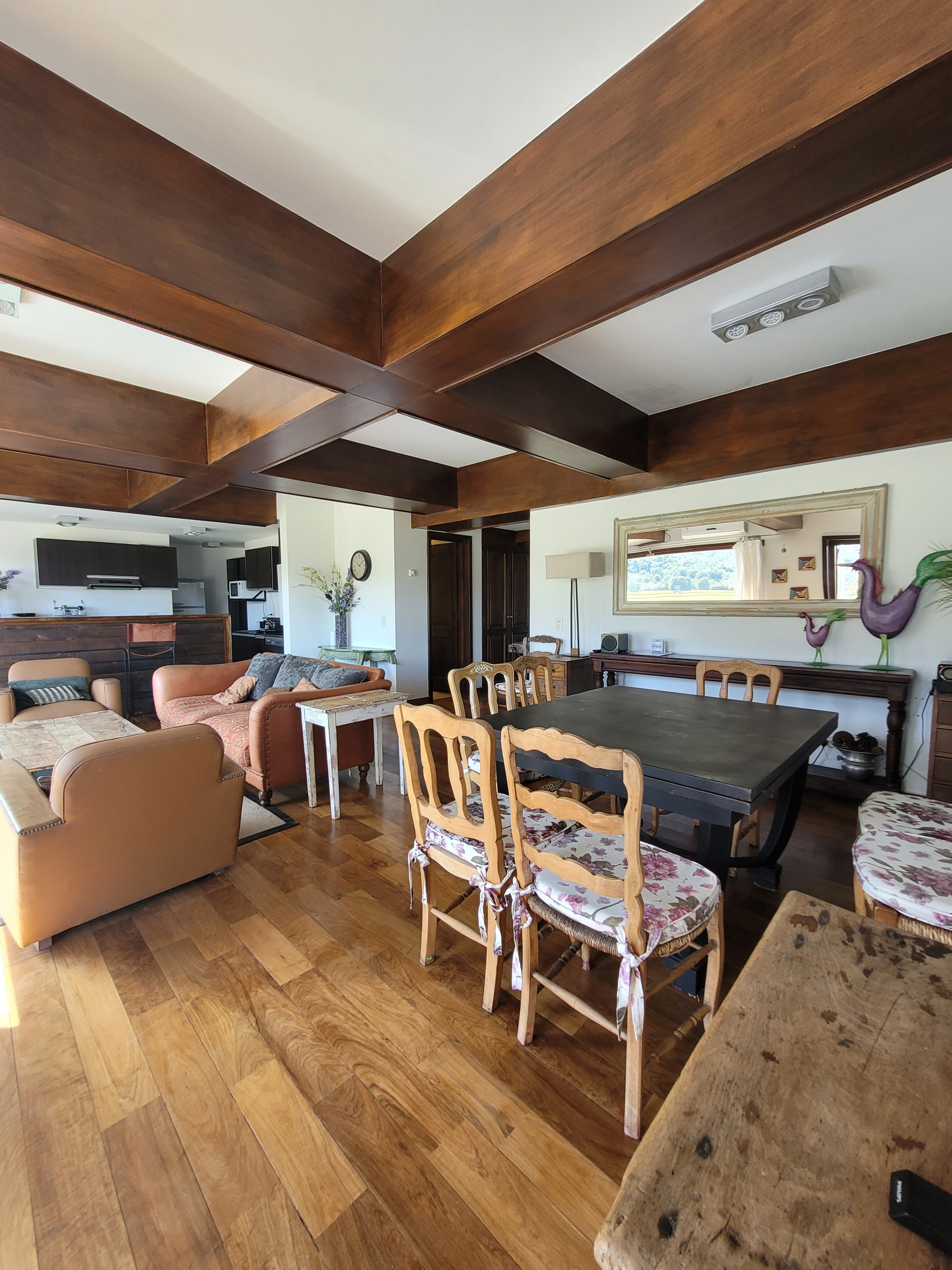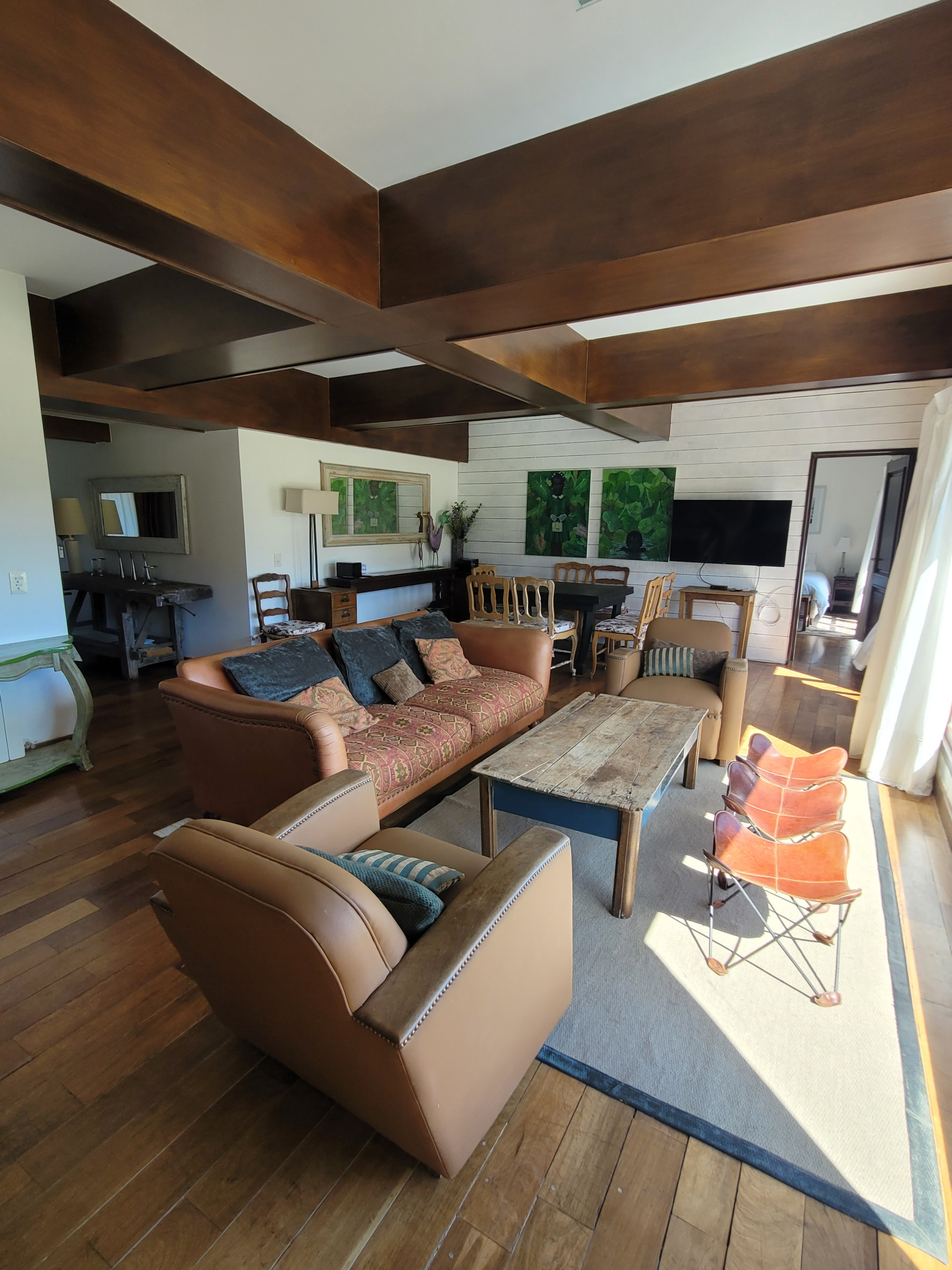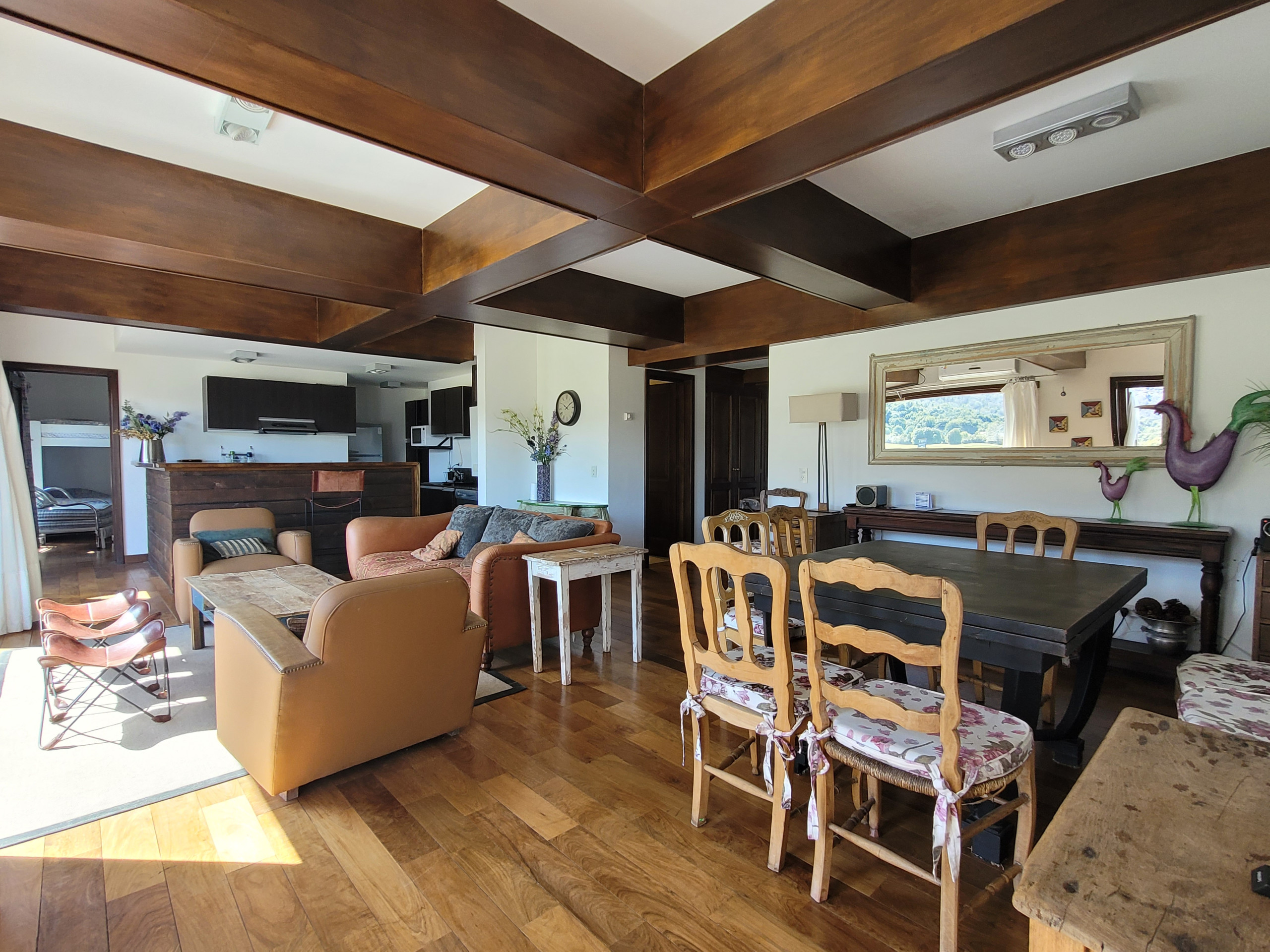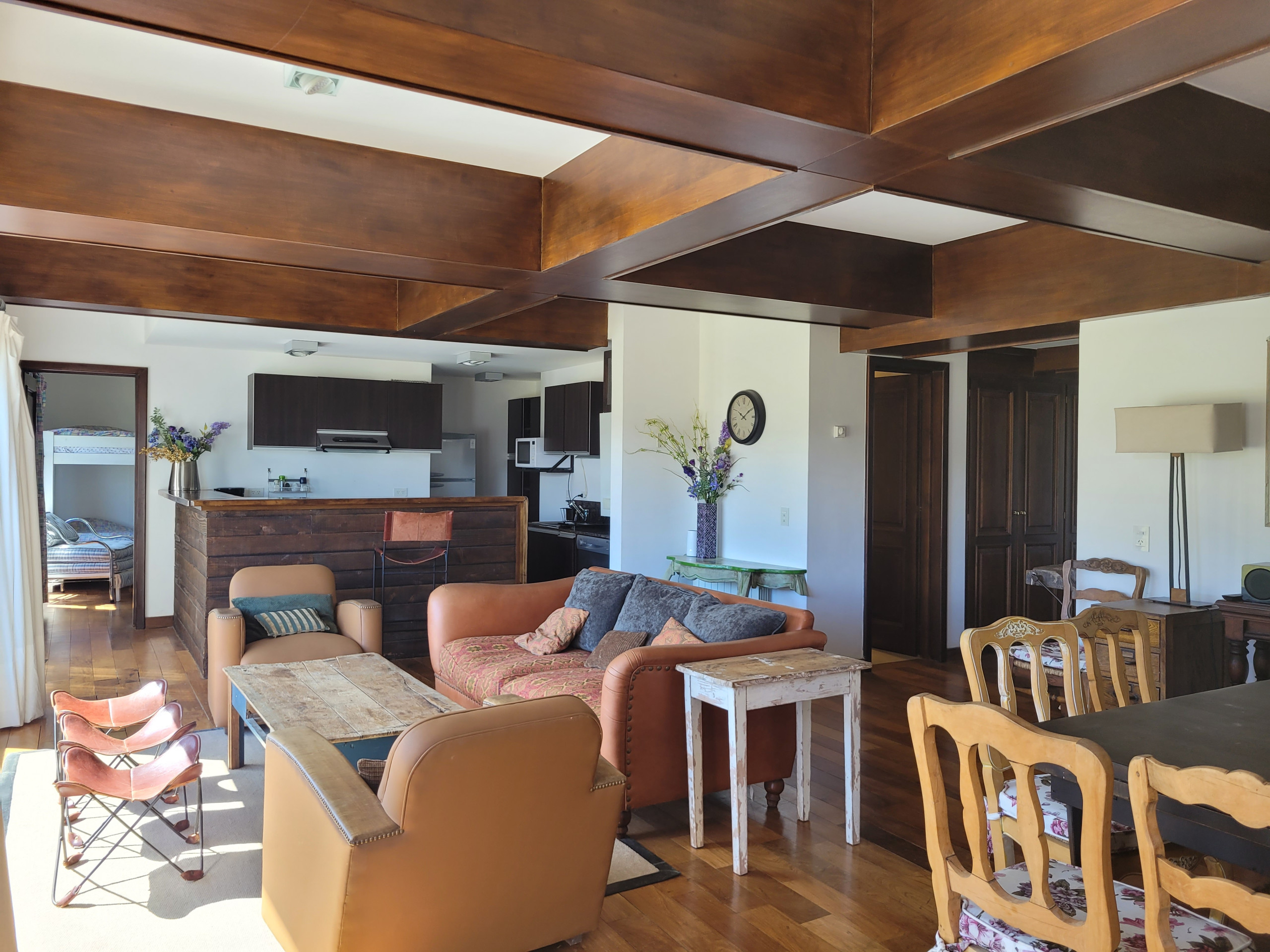 O departamento é amplo e muito acolhedor, com um belo mezanino em madeira que traz calor. No mezanino há dois setores: um com duas camas de uma praça e meia que podem ser unidas formando outra de casal, e outro com duas camas twin dispostas em L, acompanhadas de TV e rádio, ideal para relaxar ou para que as crianças tenham o seu próprio espaço.