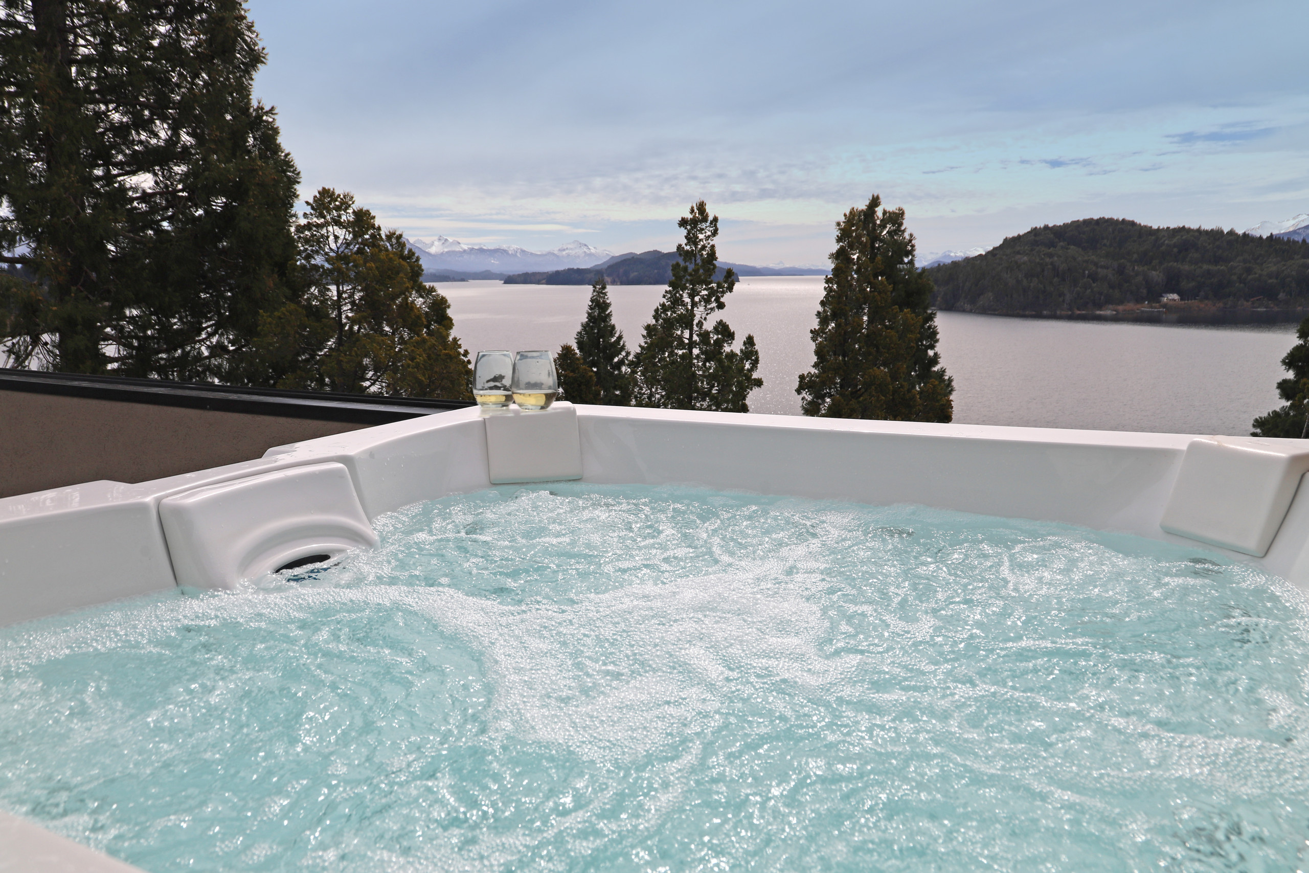 A piscina é climatizada e está situada em frente ao lago, em um cenário natural único. A temperatura pode variar levemente conforme as condições climáticas do momento, já que está ao ar livre e exposta ao clima da Patagônia.