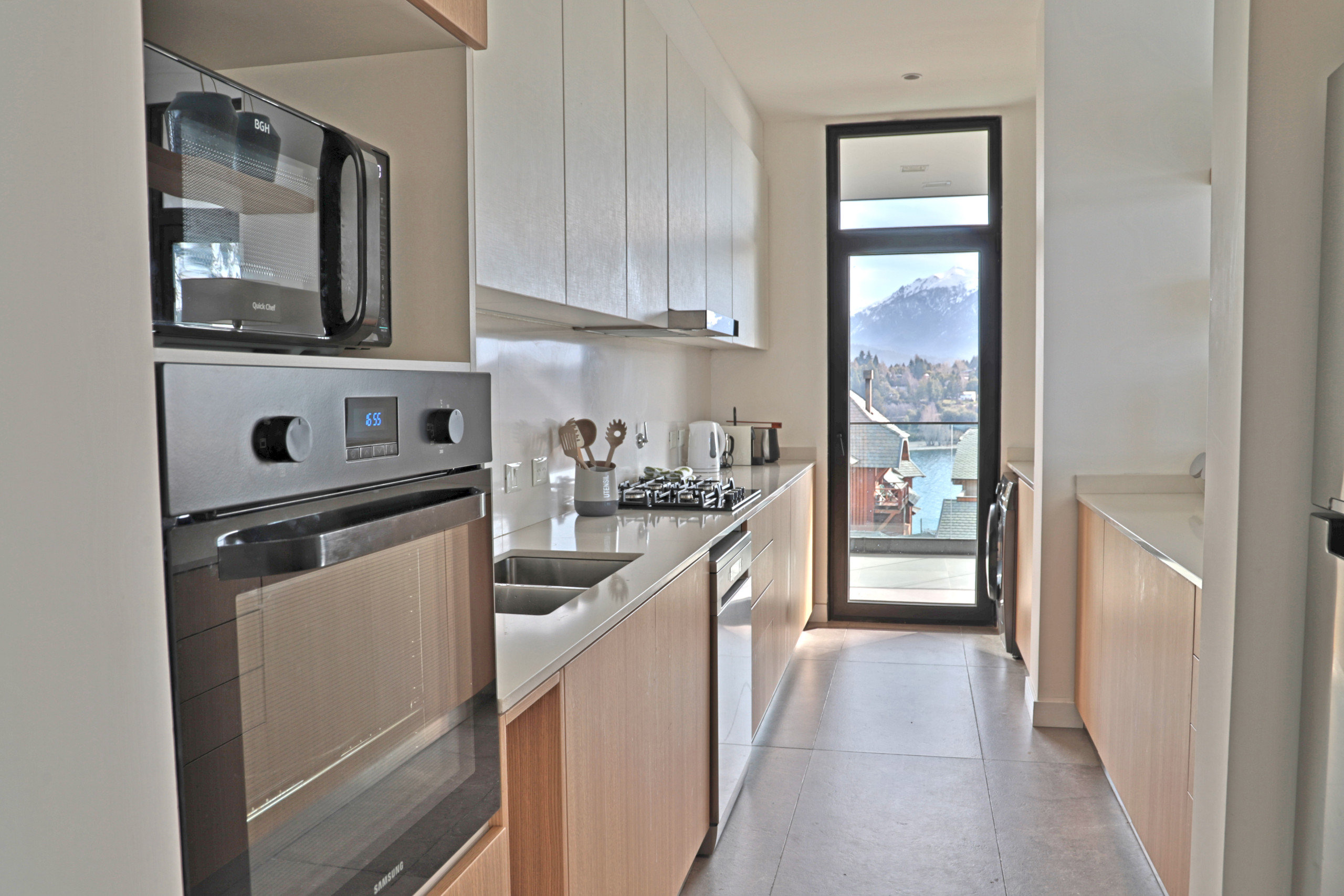 A kitchenette, de gás, está equipada com frigorífico, microondas, forno, congelador, máquina de lavar louça, louça/talheres, utensílios/cozinha, máquina de café, torradeira e jarro eléctrico.