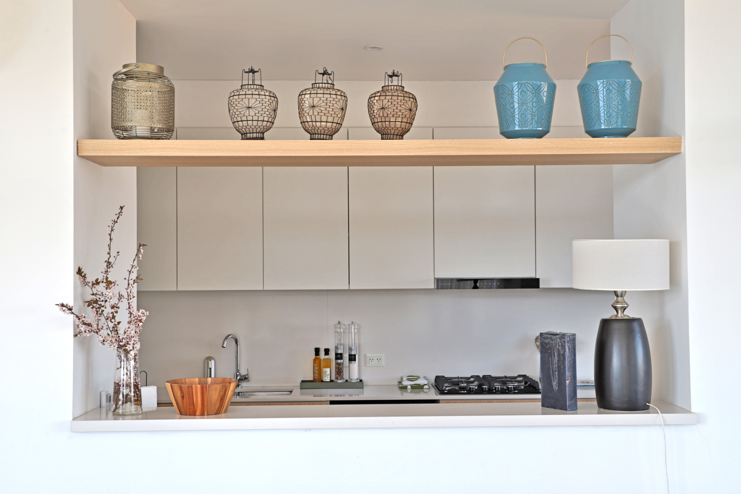 A cozinha está totalmente equipada com uma geladeira com freezer, cafeteira, torradeira, micro-ondas e uma chaleira elétrica.