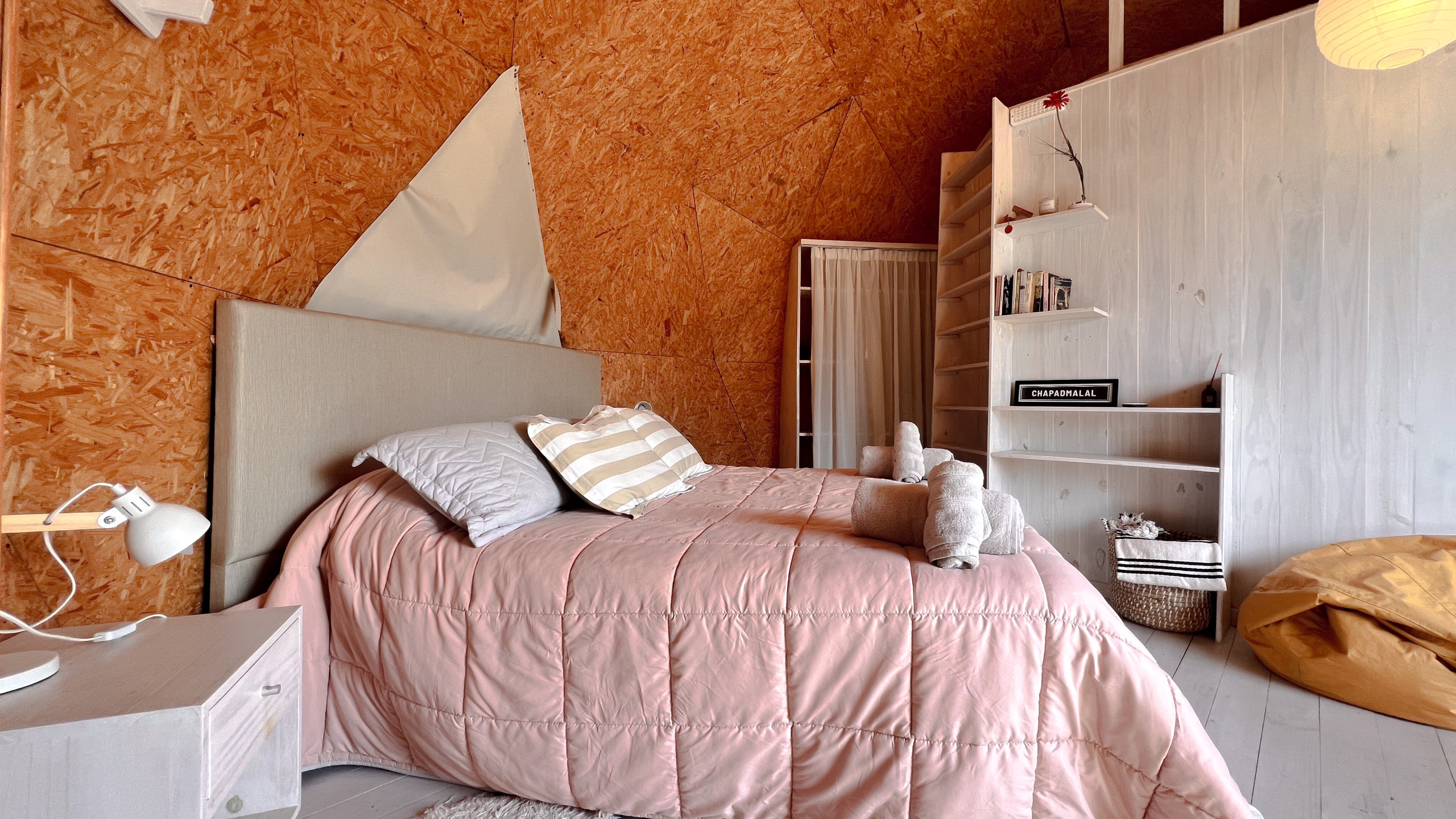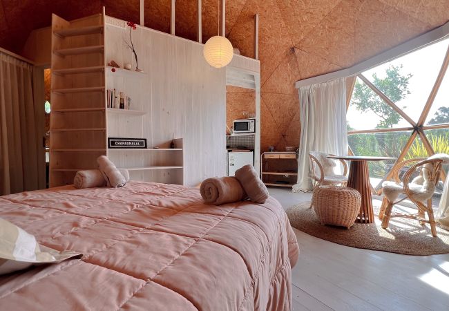 Cada domo é um loft onde cabem 2 pessoas confortavelmente e a possibilidade de um extra (criança ou criança) num mezanino dentro de cada unidade. As camas, dependendo da unidade, podem ser adaptadas para serem cama de casal ou camas individuais, pergunta-nos de acordo com a tua necessidade. Além disso, uma pequena cozinha bem equipada vai resolver todas as refeições da tua estadia e a sala-de-estar permite-te tomar o pequeno-almoço ou beber um vinho com uma temperatura quente dentro do domo no caso de não quereres estar no deck. Cada deck conta com espreguiçadeiras e espaço para poderes desfrutar de forma privada do teu descanso.