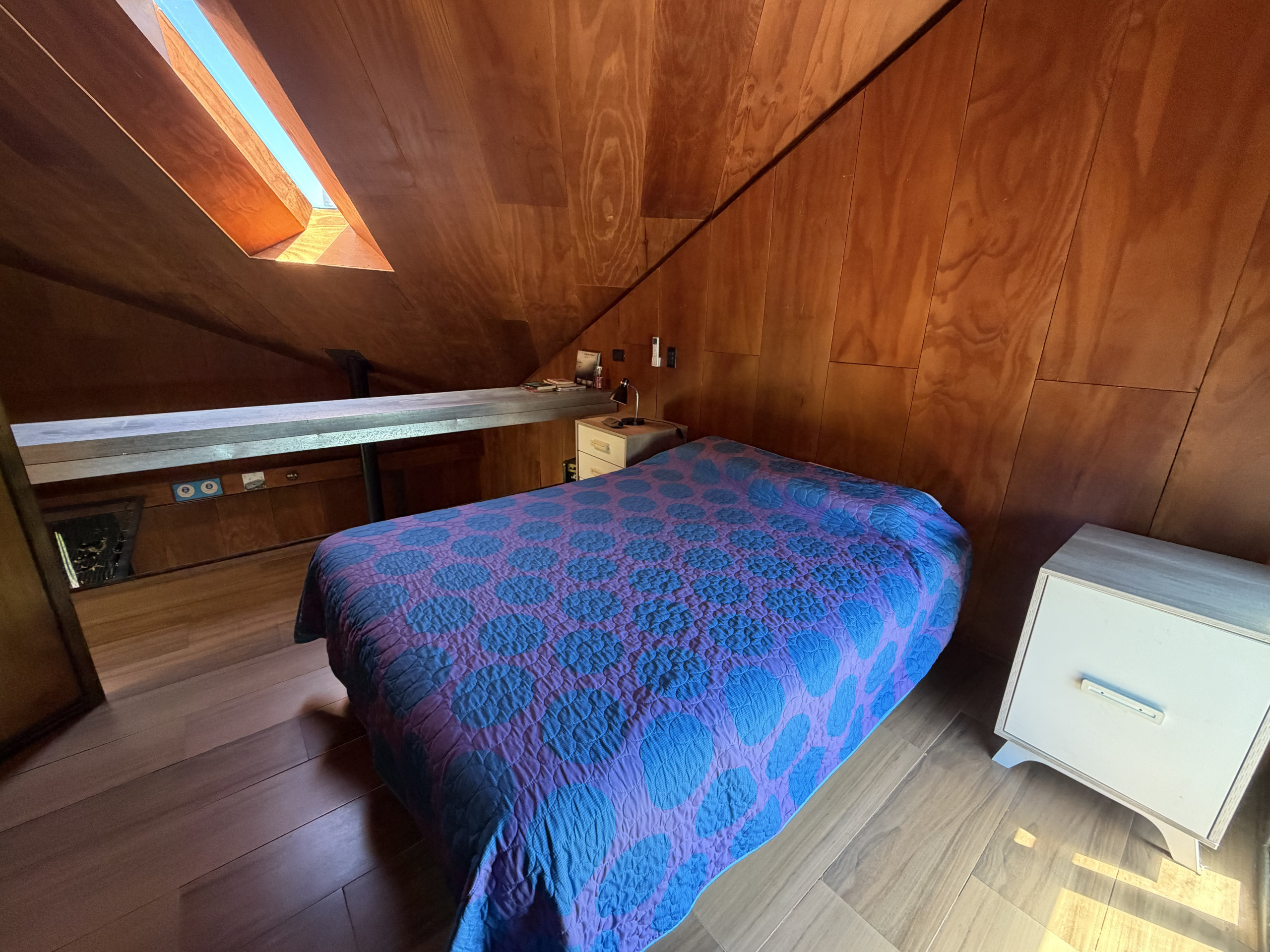 No andar superior localiza-se o quarto principal com cama de casal e um segundo quarto com cama individual, além de uma casa de banho completa.